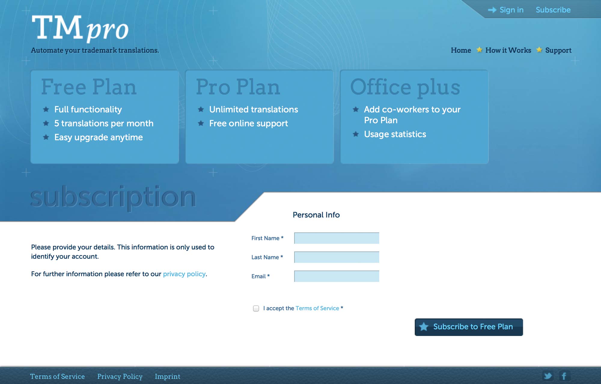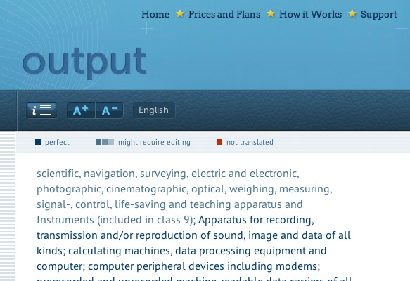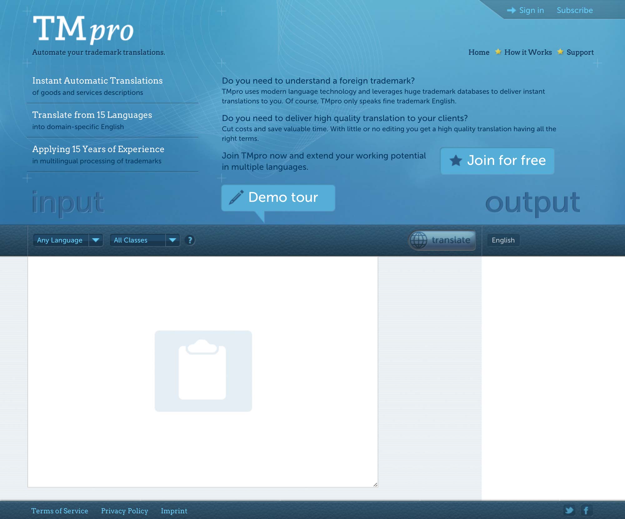 Tmpro is a webservice for trademark lawyers to translate domain-related text from 15 european languages into english.